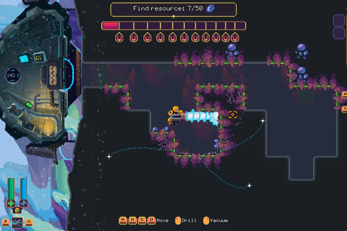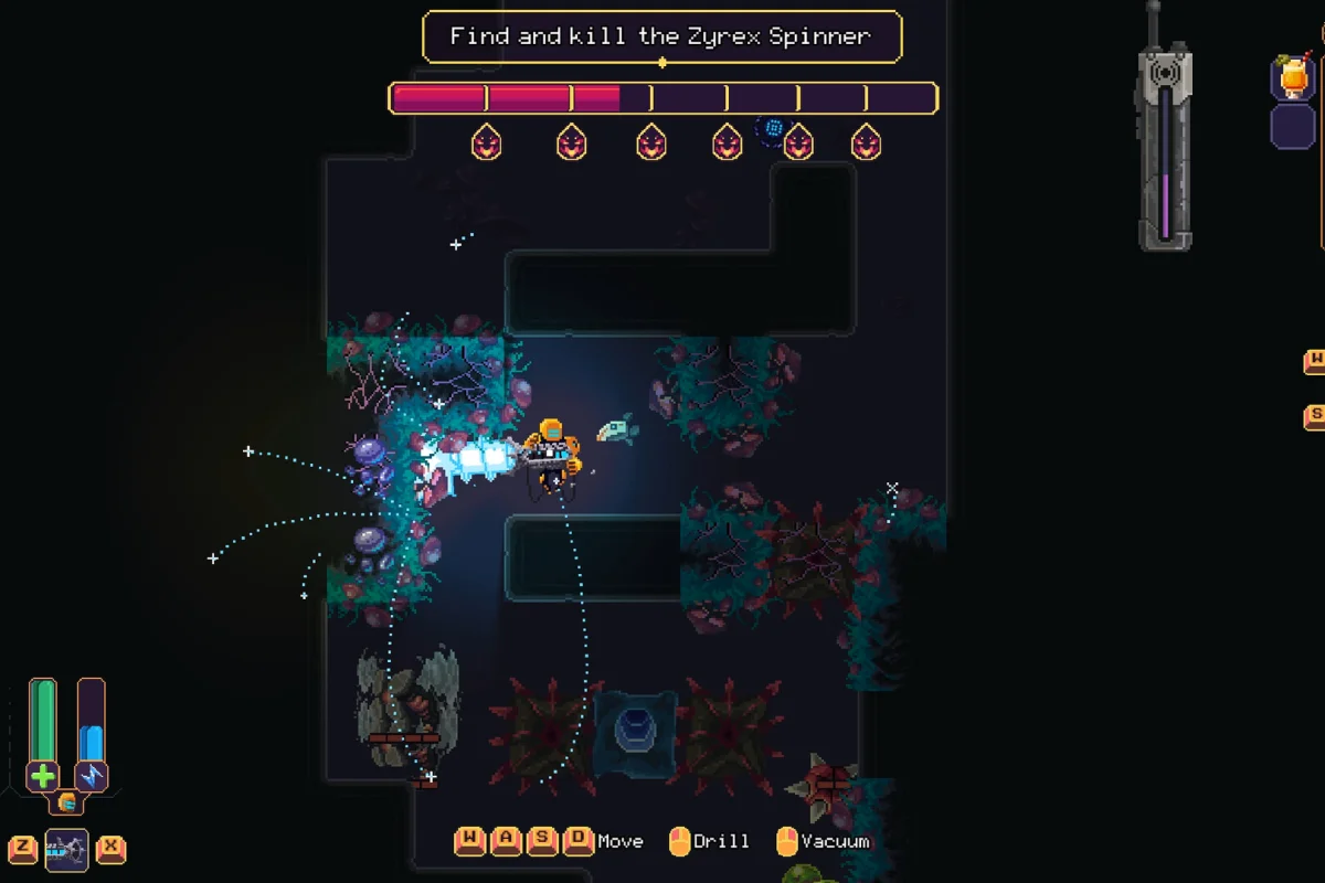 Каждый спуск — это нервная возня с железом. Вы навешиваете буры прямо на паучьи лапы, меняете модули на ходу, собираете конструкцию почти вслепую, а потом резко разворачиваетесь назад, отбиваясь от тварей, которые выглядят так, будто сбежали с чьих-то кошмарных набросков. Всё происходит быстро и грязно — времени на раздумья тут не дают.