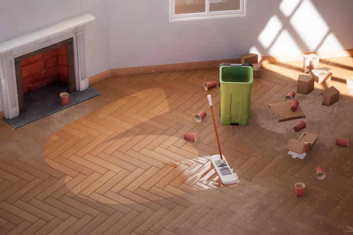 Перед тем как заняться декором, придётся привести помещение в порядок. Нужно сдирать старые обои, мыть окна, красить стены и менять покрытие пола. Эти действия ощущаются очень живо: краска постепенно ложится на поверхность, на полу остаются следы уборки, а растения чуть заметно двигаются от сквозняка.